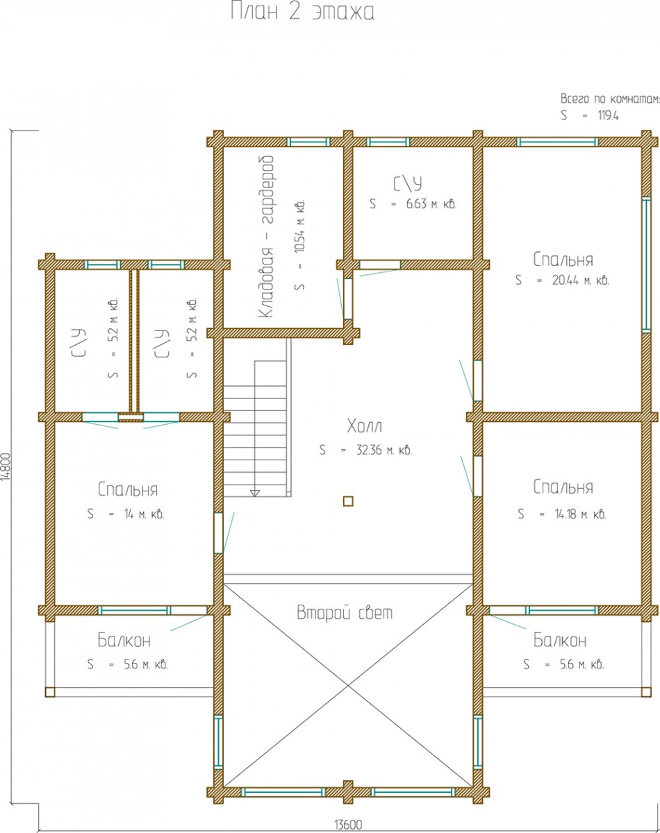 Площадь 2 этажа: 119.4 м